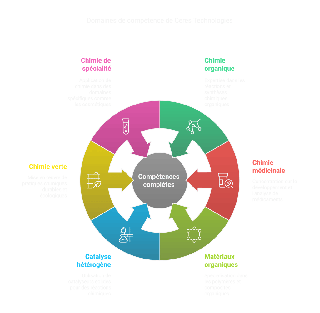 Après nous avoir décris votre problématique, nous vous proposerons une offre pour l'étude et l'analyse de la bibliographie. Nous proposerons des voies d'accès et des synthèses qui respectent les principes de la chimie verte, des procédés de fabrication, une analyse des impact environnementaux. Egalement, grâce au réseau de Ceres, nous pouvons vous mettre en relation avec de prestataire pouvant réaliser votre projet à grande échelle.